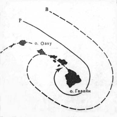 Рис.4. Схема активной части Гавайского "антициклонального" вихря. Р – ось рва, В – ось валообразного поднятия.