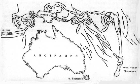 Рис. 5. Схема антициклональных вихрей по северному периметру Австралии. 1 – Восточно-Индонезийский; 2 – Ново-Гвинейский; 3 – Соломоновых островов; 4 – островов Фиджи. |