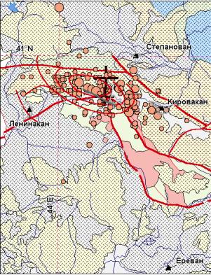 Ближайшими к эпицентру Спитакского землетрясения городами по мере удаленности являются: Спитак (несколько км, практически в эпицентральной зоне), Степанаван (15 км), Кировакан (26 км) и Ленинакан (33 км) (рис. 1). Положение этих городов относительно афтершокового поля эпицентров таково: Спитак находится в центре афтершокового поля, Кировакан полностью «накрыт» юго-восточной частью афтершокового поля, Степанаван и Ленинакан расположены в нескольких километрах соответственно на северо-восток и юго-восток от эпицентральной области афтершоков. Следствием Спитакского землетрясения явилось практически полное разрушение ближайшего к эпицентру г. Спитака. Наиболее удаленный от эпицентра г. Ленинакан значительно разрушен, афтершоки в непосредственной близости от него не зарегистрированы.