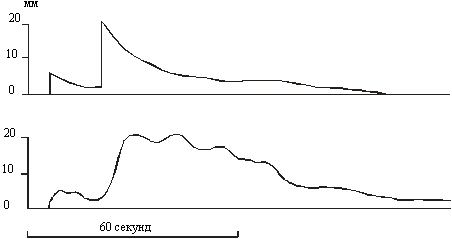 Необходимо обратить внимание на то, что соответствующие характеристики инструментальных записей на сейсмостанциях «Кировакан», «Ленинакан» и «Ереван», могут уточнить причину особенности макросейсмического эффекта в данных городах (Годзиковская, Константинова, 1989; Годзиковская, Гедакян, Товмасян, 1989). Дело в том, что для большинства афтершоков, записанных сейсмостанцией «Ереван», энергетический класс, определенный по объемных волнам – Кр (по номограмме Раутиан), совпадал с определенным, по кода-волнам – Кк (энергетический класс по номограмме Джибладзе). Но для некоторого числа афтершоков с Кр=9.5-11.5, имело значение соответственно Кк=11-13. Это происходило за счет того, что, если для большинства землетрясений записи имели импульсный характер P- и S-волн, то на ряде записей максимальные амплитуды в области S-волн несколько отстояли от времени вступления и имели завышенную длительность. Для записей первого типа Кк»Кр, для второго – Кк-Кр»2. Примеры огибающих этих двух типов землетрясений и расчеты энергетических классов приведены на рис. 2.