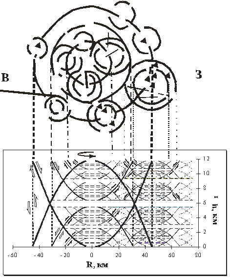 Рис.2. Смоделированное силовое поле (фрагментарно) в разрезе кольцевой структуры Джаппи (внизу) и в плане по (Гаврилов, 1992). Толщина линий на разрезе характеризует соответствующий структурный уровень; горизонтальными линиями показаны зоны динамического равновесия; треугольники в верху рисунка – рудопроявления.