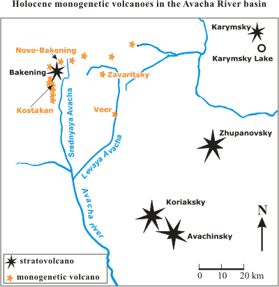 A schematic map of Holocene monogenetic vents in the Avacha river basin.