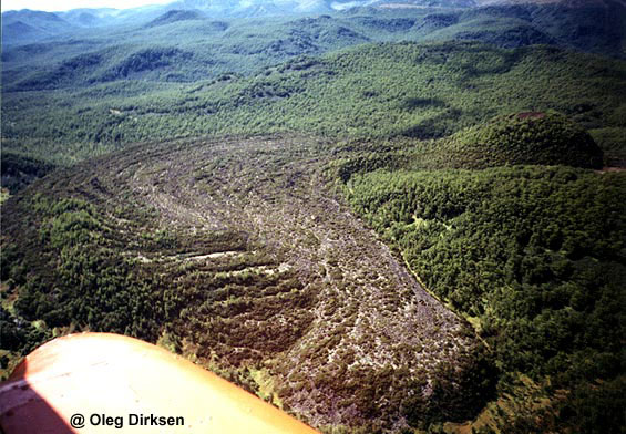 Veer ("Fan") cinder cone in the Levaya ("Left") Avacha river valley, one of the cones scattered in Avacha river basin. This eruption took place 1600-1700 years BP, as suggested by stratigraphic position of its erupted products between OP (1500 years BP) and KS1 (1800 years BP) marker ash layers (Oleg Dirksen, personal communication).