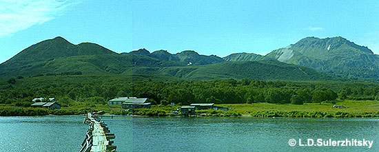 Dikii Greben’ volcano seen from northeast, across Ozernaia river. Mt. Nepriyatnaya (summit of the volcano) is at the right. Lava domes and huge landslide blocks from Mt. Nepriyatnaya form a chain going to the left, towards the Kurile Lake. The upper terrace closer to us is composed of the Kurile Lake caldera ignimbrite (7600 yrs BP). Two lower ones correspond to different levels of the Kurile Lake. The houses are located on the lowest terrace with an age of ab. 1300 14C yrs BP.