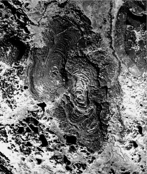 Airphoto of Bliznetsy lava flows. These adjacent lava flows were erupted from two closely spaced vents during a single eruption ~3 ka BP.