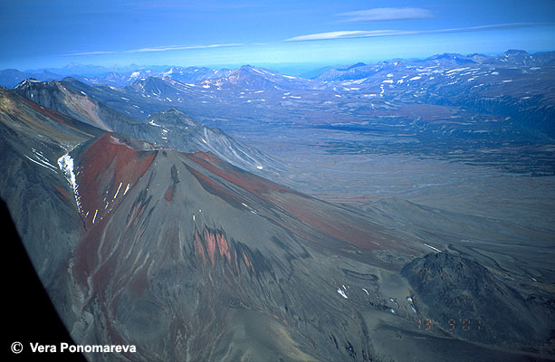 Holocene cone of Gamchen volcano named Baranii ("Sheep's") is sitting on a slope of its Late Pleistocene predecessor. An extrusive dome Lukovitsa ("Onion clove") is at the right. Its formation took place during one of the active periods of Baranii cone, between 3600 and 3000 14C years BP. Both are composed of low-potassic basalt-basaltic andesite.