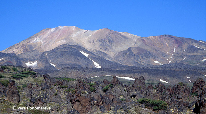 Komarov volcano from the east. The rocks of the summit part of the volcano are strongly altered due to hydrothermal activity. Lava flows of the volcano formed about 1500 14C years BP, and are covered by SH2 (1000 14C years BP) and SH3 (1400 14C years BP) marker ashes from Shiveluch volcano as well as by ashes from recent Komarov eruptions.