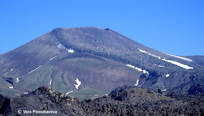 Vysokii ("High") volcano looking northwest. This volcano appears to be the northernmost Holocene vent of the Eastern volcanic belt - frontal, subduction related volcanic zone of Kamchatka. Located farther north enormous Kliuchevskoi volcanic group is shifted westward and likely has a more complicated origin related to the evolution of the Kamchatka-Aleutian corner (the junction of Kamchatka and Aleutian arcs). Vysokii volcano has been active from the beginning of Holocene till at least 2000 14C years BP, when it produced the lava flow seen at this photo. The lava flow is overlain by SH2 (1000 14C years BP) and SH3 (1400 14C years BP) marker ashes from Shiveluch volcano, OP ash (1500 14C years BP) from Baranii Amphitheater crater at the foot of Opala volcano, and by KS1 marker ash from Ksudach.