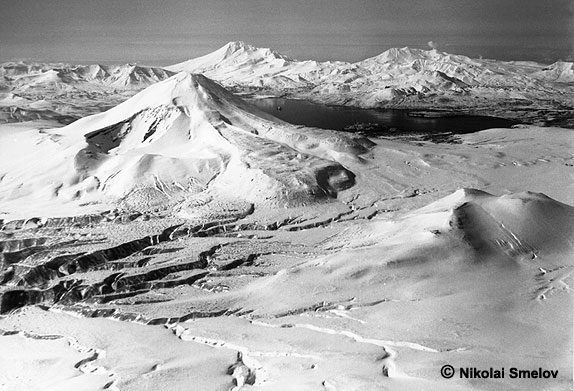 View to the Kurile Lake and Iliinsky volcano from Zheltovsky volcano. Dissected surface of the Kurile Lake caldera ignimbrite is in the foreground. Iliinsky is located in a depression, which may be a collapse crater of the late Pleistocene pre-Iliinsky volcano. The collapse is believed to occur due to the earthquakes accompanying the caldera-forming eruption ab.7600 14C yr BP. Large fresh crater on the Iliinsky slope formed as a result of the 1901 phreatic eruption. Dikii Greben' extrusive massif is on the right just across the Kurile Lake. Kambalny and Kosheleva volcanoes are in the background.