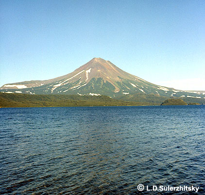 Iliinsky volcano from the southwest, viewed across the Kurile Lake. Northern (left) slope of the volcano is composed by thick andesitic lava flows, formed ab 2000 yr BP.
