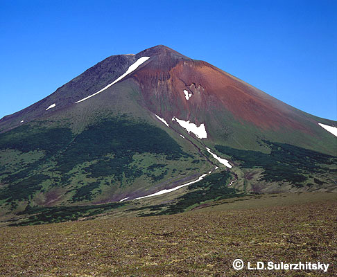 Iliinsky volcano from the south. Volcanic cone bears scars from past landslides. Flat surface of the Pleistocene lava plateau, covered with tundra, is at the foreground.