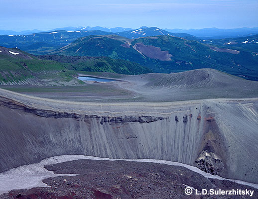 Northern inner wall of the 1901 crater at the eastern slope of Iliinsky volcano. The crater exposes the erupted products from Iliinsky: the lava flow at the right is overlain by white pumice (ZLT), dated at 4850 14C yr BP, and younger tephras. The upper stratified package of tephra is from the 1901 phreatic eruption. At the background, a blue lake separates thick andesitic lava flow (ab.2000 yr BP) at the left and a rim of the early Holocene collapse crater enclosing Iliinsky volcano - at the right.