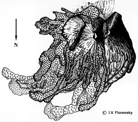 A shematic map of Kikhpinych volcano. Three Holocene vents from right to left (or from west to east) are: Zapadnyi ("Western") cone built 4200-4100 14C years BP; Savich cone active since 1450 14C years BP; Crab lava dome, which formed on the eastern slope of Savich cone only few hundreds years ago. A pyroclastic flow unit of the initial phreato-magmatic eruption, underlying the Savich lava flows, is seen near their edges. Lava flows of Savich cone were erupted in three stages: 1350, 1250-1300 and 600 14C years BP. They are shown with different fillings.