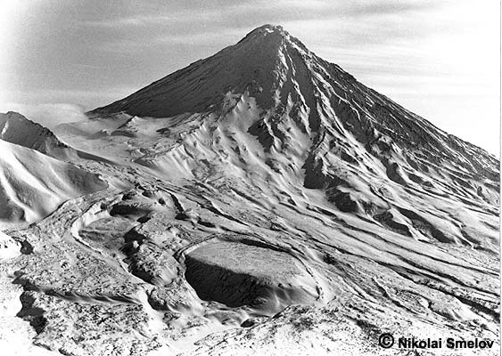 Koriaksky volcano viewed from the southwest. Holocene lava and pyroclastic flows descend from the volcano and flow around older volcanic landforms.