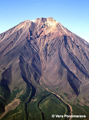 Koriaksky volcano viewed from the south. Holocene lava flow with well-expressed marginal levees starts from a flank vent at the slope of a deep gully. This photo was taken in August 2000, and it is a rare case that the volcano can be seen without its snow and ice cap.