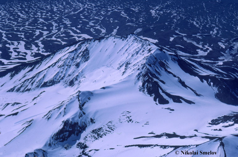 Kozelsky volcano from the north. The edifice of the volcano is destroyed by a late Pleistocene collapse crater. Ruins of the late Pleistocene lava domes are at the foreground. The collapse crater hosts a glacier.