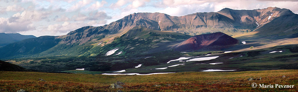 Tobeltsen cinder cone (58°15'N, 160°44'E, elev. 831.8 m) seen from the southeast. Its lava flow descends to the Voyampolka River valley to the left. Based on tephrochronology and radiocarbon dating, Tobeltsen cone formed ~3.5 ka BP. It is the northernmost volcanic vent among the Holocene Kamchatka volcanoes found so far.