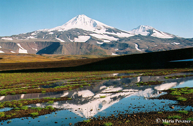 Late Pleistocene Ostry volcano (at the left) and mid-Holocene X Cone (at the right) seen from the northwest. Ostry slope is destroyed by a large landslide crater formed likely in the early Holocene time.