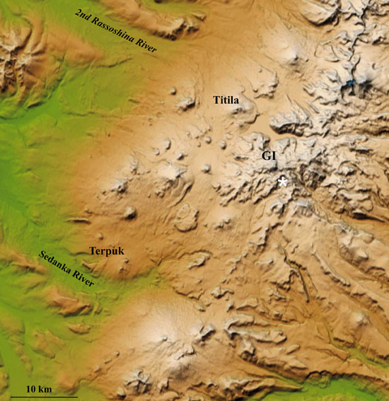 Shaded SRTM elevation model showing the Sedanka lava field (a part of the image released by NASA/JPL/NIMA). Holocene eruptive centers are located west of the Sredinny Range axis. They include Gorny Institute (GI in the map) and Titila large volcanoes and numerous cinder cones. A source of Sedankinsky lava flow is marked with a white asterisk.