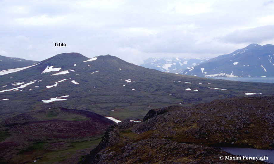 Titila shield volcano viewed from the south. Titila started to form in the late Pleistocene time. The volcano was active 10-8 and 3-2.5 ka BP (14C) (Dirksen et al., 2003, 2004). A flank vent (a summit in front of Titila) was formed in early Holocene. Its lava flows dammed a river to form Glubokoe ("Deep") Lake (at the far right). Titila eruptives are transitional from medium to high-K basalt.