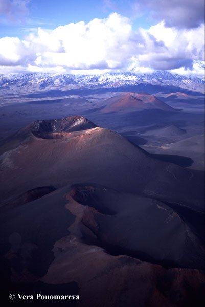 Cinder cones south of Tolbachik volcano (in clouds). Two cones in the middle of the photo are the first and second cones of the Northern group, formed in 1975. The cone at the foreground was formed ~1700 14C yr BP and now is covered by a blanket of black scoria from the 1975 eruption.