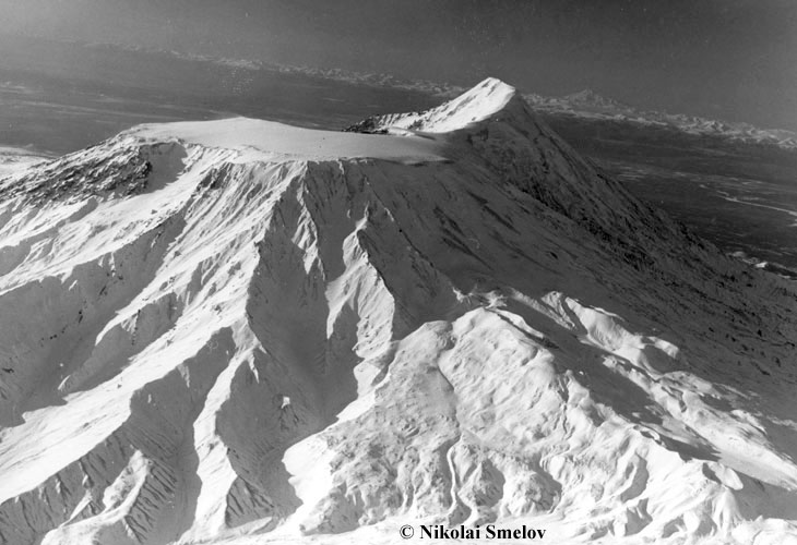 Tolbachik volcano viewed from the northeast. Plosky Tolbachik (at the foreground) is crowned with a summit caldera filled with a glacier. The northeastern (right) slope of the volcano is cut by a Holocene fissure zone – a source of numerous lava flows.