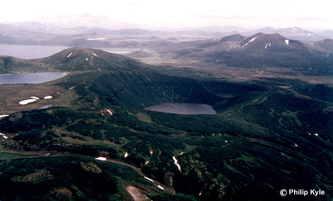 Chasha ("Chalice") crater filled with a lake is in the middle of the photo. It formed about 4600 14C years BP and produced about 1 km3 of rhyolitic tephra (marker ash layer OPtr). Chasha crater is located in the northern part of the Tolmachev Dol (Plateau) and surrounded by Holocene basaltic cinder cones. Next lake at the left was dammed by the Chasha eruption products. The most distant water at the left is Tolmachevo Lake; Tolmacheva river valley is between Chasha lake and distant cones at the right.