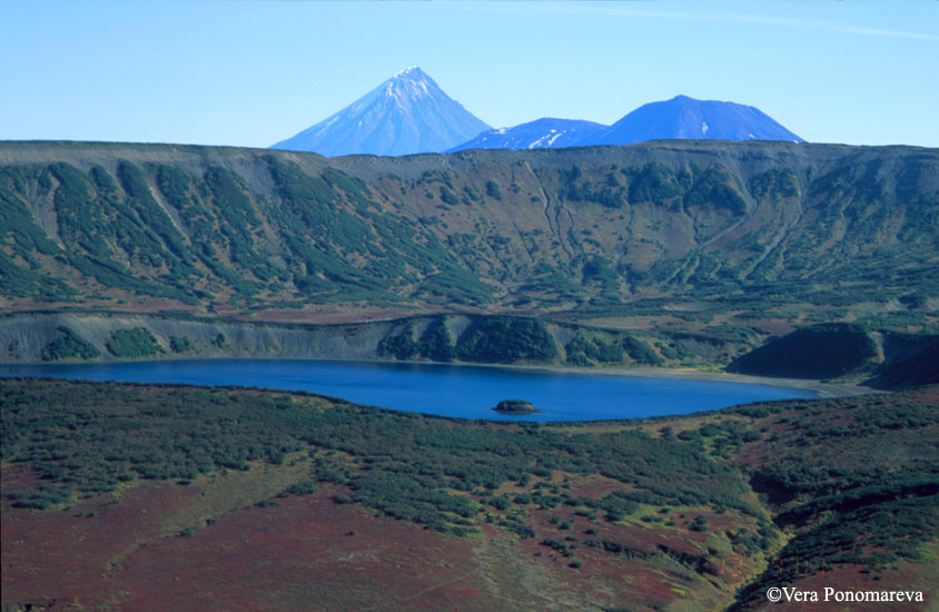 A Holocene tuff-ring hosting Dalnee Lake in the northern part of the Uzon caldera. The tuff-ring formed 7.6-7.7 ka BP and produced dark-gray andesitic cinder. It is the only Holocene magmatic feature within the caldera. A cone of Kronotsky volcano and two flat edifices of the Krasheninnikov volcano are seen behind the caldera rim.