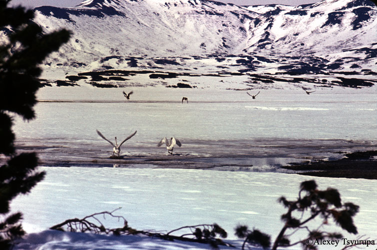 White swans in non-freezing lakes in the Uzon caldera. The photo was taken in May, 1980.