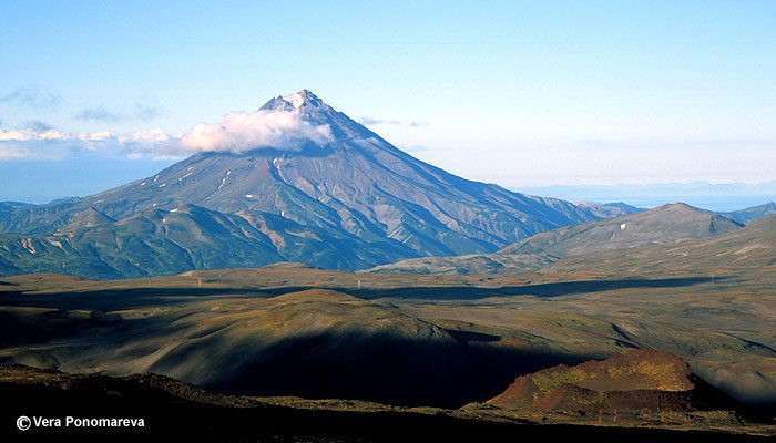 Viliuchinsky volcano looking northeast from the slope of Gorely volcano. Viliuchinsky was constructed mostly in Late Pleistocene with only minor Early Holocene activity. The plateau in the middle of the photo is constructed of Late Pleistocene welded tuff from Gorely caldera. Note a nice tuya cinder cone at the Gorely slope at the right foreground.