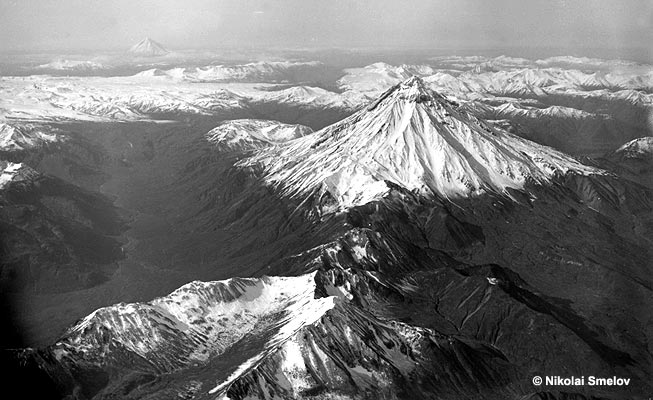Viliuchinsky volcano looking west. The volcano's edifice sits on the eroded plateau composed of Pliocene-Miocene rocks. Deep valley of Viliucha river is at the left.