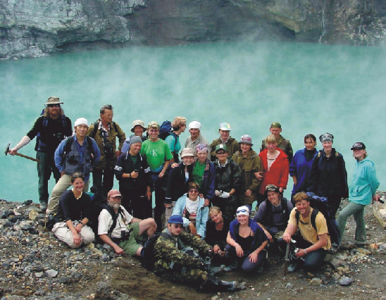 Фото на 2 стр. обложки. Участники Международной молодежной школы-семинара у кратерного озера вулкана Мутновский (фото П.Э. Избекова).