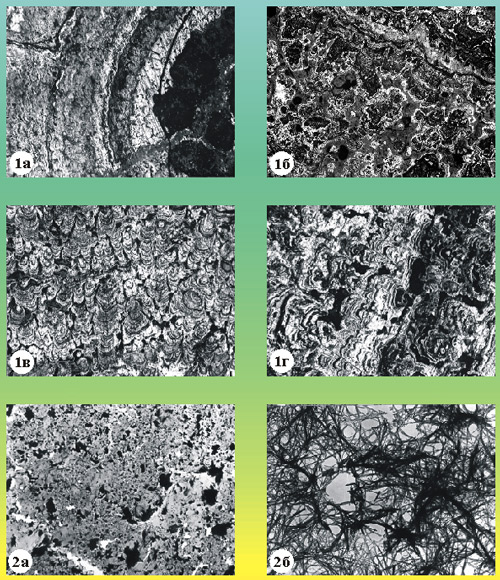 На обложке иллюстрации к статье: Ожогина Е.Г. и др. “Особенности методики изучения минерального состава железомарганцевых конкреций океана”. Рис.1. Колломорфные структуры (концентрически-зональная, фестончатая, ажурная, коралловидная) железомарганцевых конкреций Тихого (а,б) и Атлантического (в,г) океанов. Полированные шлифы. Увел. 250. Николи -. Рис.2. а). Скрыто-тонкокристаллическое микростроение железомарганцевцевой конкреции тодорокит-вернадит-бернесситового состава Тихого океана. Реплика с полированного шлифа. Увел. 17000; б). Железо-бактерии в конкреции Тихого океана. Реплика со скола. Увел 25000. |