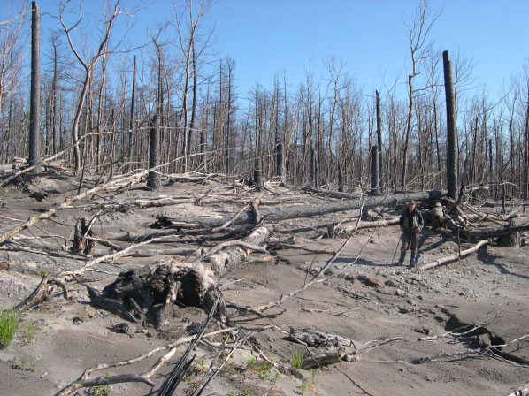 наземными и дистанционными методами". Рис.3. Участок леса, уничтоженный пирокластическим потоком при извержении вулкана Шивелуч 27 февраля 2005 г. Фото О.А. Гириной. |